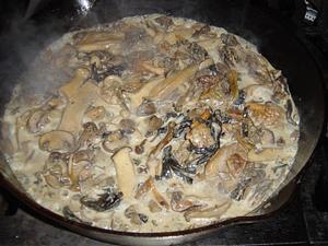 Cook some garlic and shallots in some white wine vinegar and some white wine. When almost dry, add heavy cream. Sauce the side of the plate with the shrooms in the middle