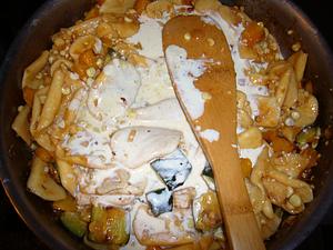 While broth reduces, drain pasta. Add about 1/2 can of diced tomatoes (Progresso roasted tomatoes works well) and cook for a few minutes, stirring. Add the pasta and the roasted squash/zucchini to the pan and toss.