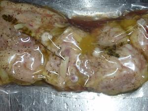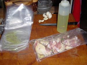 place three thighs (one serving) in each boilable bag. Try to keep the garlic sliver on each thigh, and the thyme aligned on the thighs, but this is not critical.