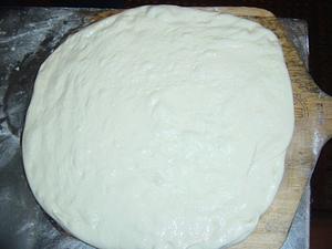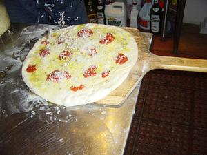 Shape the dough. Since we use the oil storage method, this is a little tricky. You have to remove the dough from the storage container keeping the top of the dough dry, and free of oil. Place it on the work table. Sprinkle some flour on the top of the dough, and on the peel. Use your hands to stretch the dough. Our recipe is moist, and soft, so this should be rather easy right on the table.