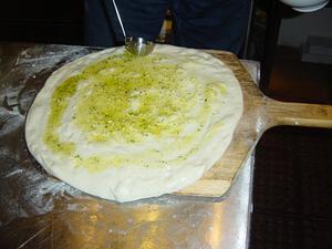 Use a ladel to spread some of the garlic oil/sauce onto the pizza... Be sure to avoid getting any on the peel.