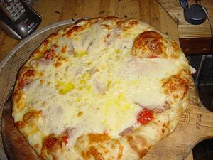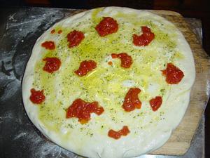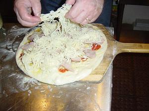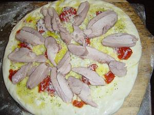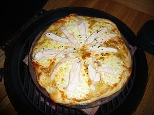 Here's a picture of a chicken caesar pizza. I made my own caesar dressing ( Ceasar Dressing ) which I spread on the raw dough, added cheese and the chicken which was pre-cooked sous-vide.