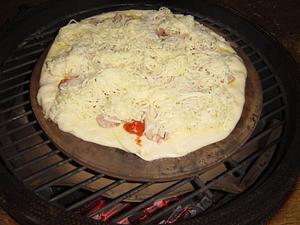 I pre-heated the egg to about 500. I put the plate setter upside down with the normal grate on the plate setter feet. Then put my pizza stone on the grate. This avoids direct flames on the pizza stone. Preheat for about an hour so the stone is good and hot. Also, you may want to quickly wipe the stone with a damp cloth (carefully) just before you put the pizza on. This will cool it just a bit, and help avoid a burnt bottom.