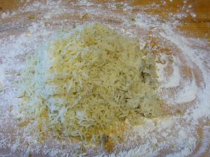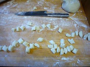 Adding as much flour as is needed, work the potatoes into a dough. This is a feel type of thing. Too much flour will make the gnocchi tough, and not enough will cause them to fall apart when boiled. Knead the flour into the dough till it's smooth, but still somewhat sticky.
