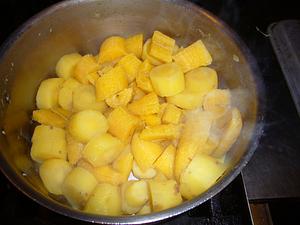 Cook sweet potatoes and yellow plantain in water till potatoes are tender. Drain, and return to pot.
