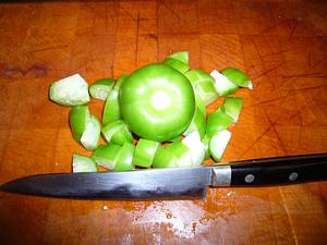 Add onion, peppers and saute briefly. Discard the cinnamon stick, and add the tomatillo. Puree in a blender until very smooth