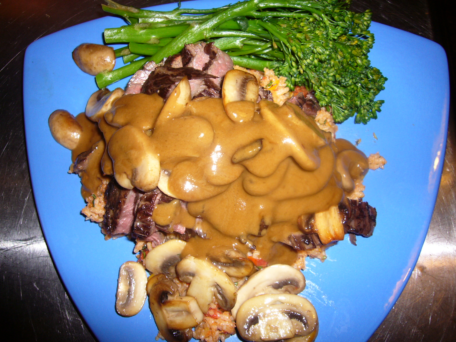 Adjust seasonings to the sauce. If you sauted mushrooms, place them on top of the steak, and then top with the reduced sauce.