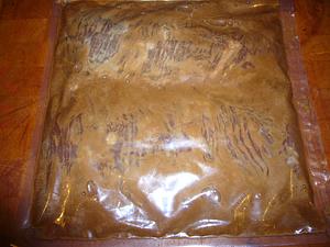 Put steak in a vacuum pouch and add marinade. Chill for an hour before sealing. This marinates the steak AND makes sealing easier as marinade is cold and won't bubble up. Seal and put in water bath at 54.4C (130F) for at least 24 hours.