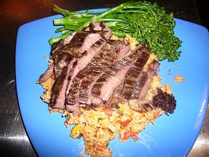 I like to make the Spanish rice recipe with this.... but whatever starch you're using, if any, put on the plate and then top with the steak sliced against the grain.