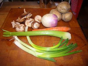 Peel turnip and put on to boil with un-peeled potatoes. Cook till done. Prep remaining vegetables.