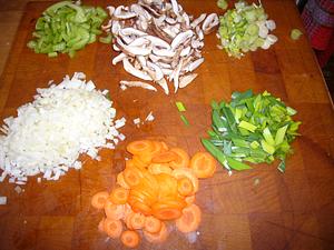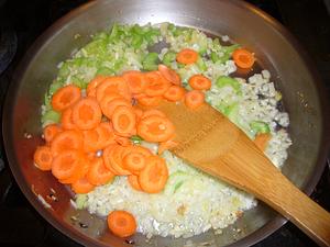 Melt 1 Tbls butter in saute pan with some oil added. Saute the onions till translucent. Add minced garlic and celery and cook till celery turns bright green. Add carrots. When carrots just start to soften, remove and reserve vegetables. Add peas to vegetables.
