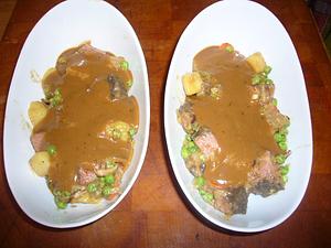 Portion the vegetable-beef mixture in 6 baking dishes and cover with a ladle of gravy (see attached recipe). Cover with a pie crust and bake at 425F for 15 to 20 minutes.