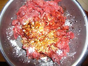 Mix the beef with the corn starch, half of the soy sauce, half of the sherry, half of the sugar, and the sesame oil. Mix this very well, and allow to marinate in the fridge for about half an hour.