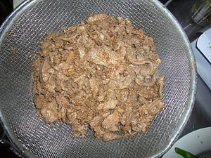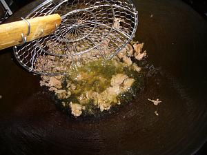 Heat the oil in the wok till about 300 (yes this is low, so the meat doesn't clump together). Cook the beef, in batches, till just brown on the outside. Remove to a sieve to drain.