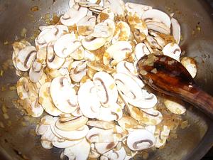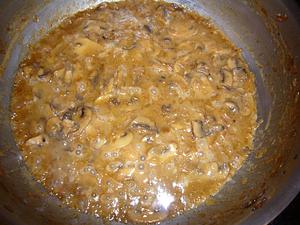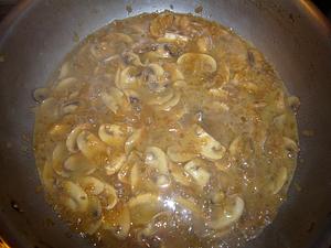 When the mushrooms are tender and have given up their moisture, add the chicken stock and the porchini powder. Reduce till sauce reaches desired thickness. Just before serving adjust seasoning and add chopped parsley and heavy cream.