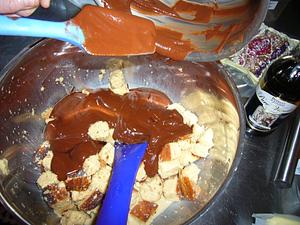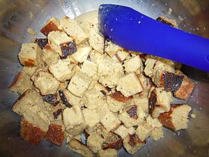 Add the bread cubes to the the milk mixture and stir until most of the milk mixture is absorbed.