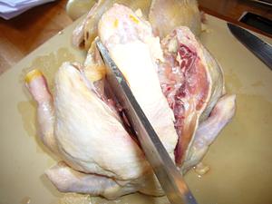To spatchcock the chickens, first cut down one side of the whole chicken, and then the other to remove the spine.
