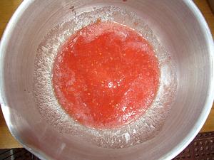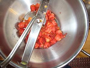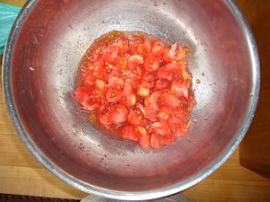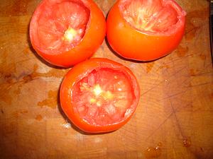 Cut enough of the bottom of the tomato off to create a 1.5 inch diameter disc. Using a mellon baller, hollow out the tomato reserving the removed pulp. Make sure to NOT break through the skin or stem of the tomato. Reserve the bottoms.