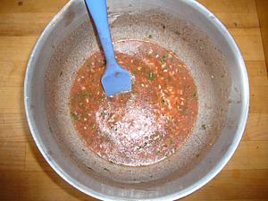 Finely mince the garlic and the herbs. You can use the herbs of your own choice. I used about 2T of chives and 2T of fresh oregano that turned out great!. Basil, parsley, thyme would all work well. Add the olive oil as well, mix, and season with salt and pepper to taste. Add some red pepper if you want a little spice. Add the rice. and mix.