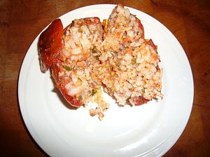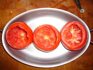 Put the tomato shells into a baking vessel, then fill with the tomato/rice mixture. Place reserved bottoms on top of the filling and bake at 400 for about an hour. Start checking them at about 45 minutes. They should start to shrivel.