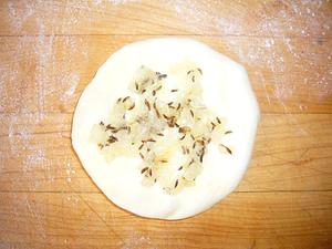 Lay the disc on your bench, and spread a tablespoon of the onion mixture on top.