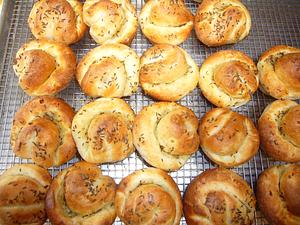 Spray the roll tops with water and sprinkle with more caraway if desired. Bake at 350 till golden brown on top. Turn out onto a rack to cool.