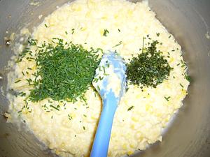 While corn sautes, cream the remaining corn in a blender and assemble remaining ingredients.