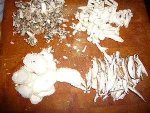 Break up or slice the mushrooms. Use a variety. Here I have 4 types.