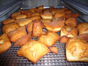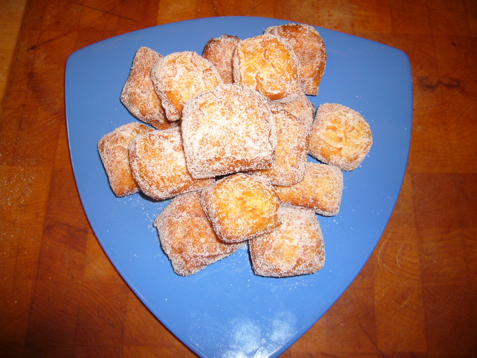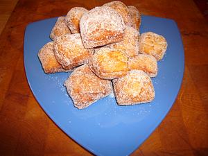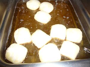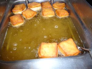 Preheat fryer (or other deep fat frying vessel) to 350. Cut dough into 2.5 inch squares. Fry on first side till golden.