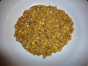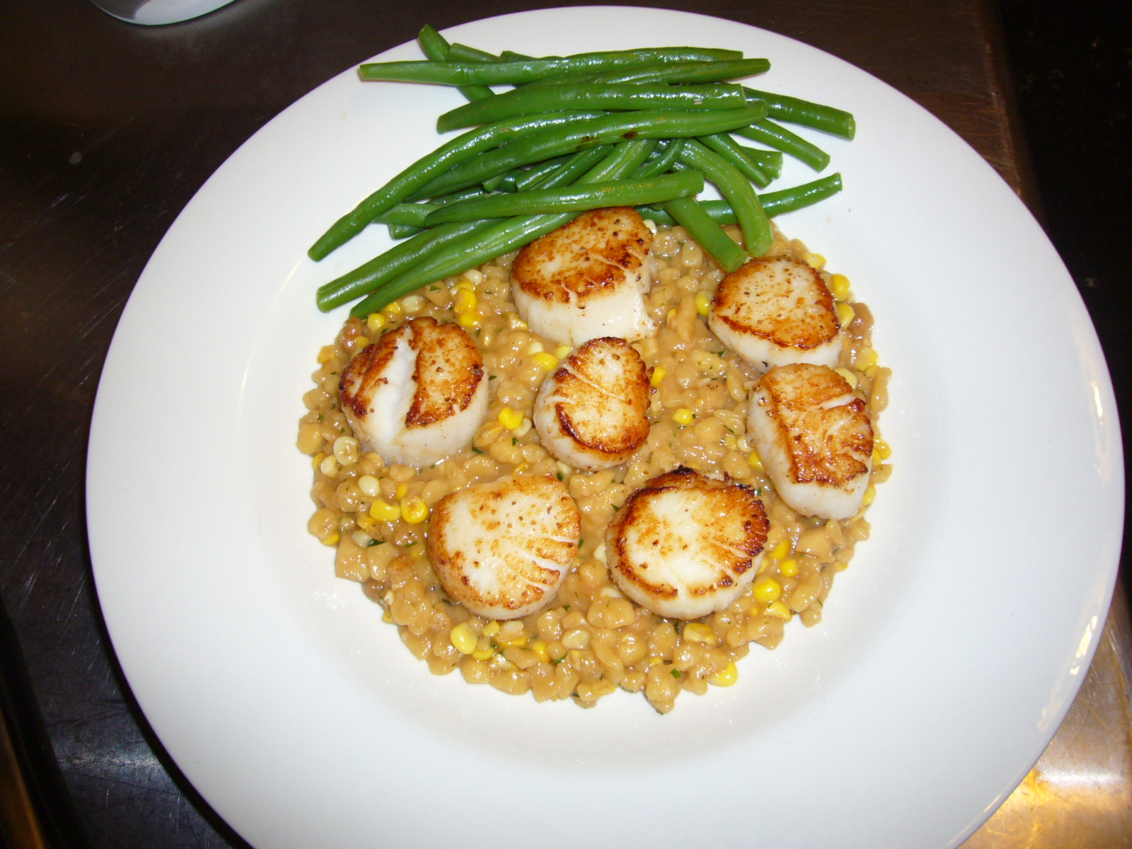 Place some of the pasta corn mixture on the plate, and then arrange scallops on top.