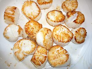 When the pasta is done, stir in the cream, tarragon, and juices that accumulated around the scallops.