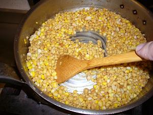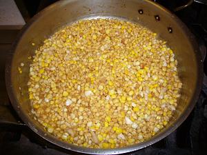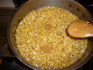 Cut the corn off the cob. Mince any scallop trimmings and broken pieces. Deglaze the pan with the white wine. When almost evaporated, add the minced scallops and the corn.