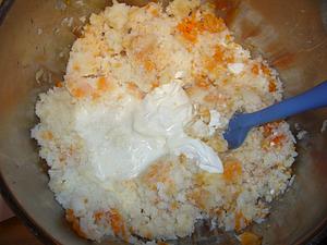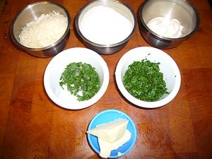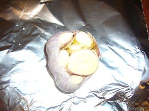 Remove the garlic from the egg, and smash 2 cloves. Add 1/2 the cheese, the butter, the cream, the sour cream, the roasted garlic, and salt and pepper to taste.