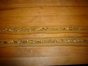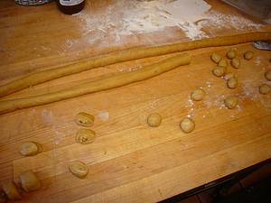 Pinch the dough closed over the nuts and roll some more to tighten the rope. Cut into 3/4 inch pieces.