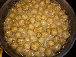When the syrup reaches a boil, add the dough balls.