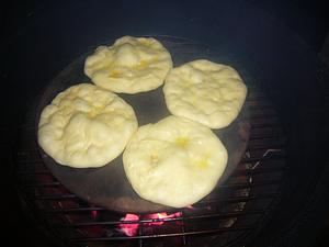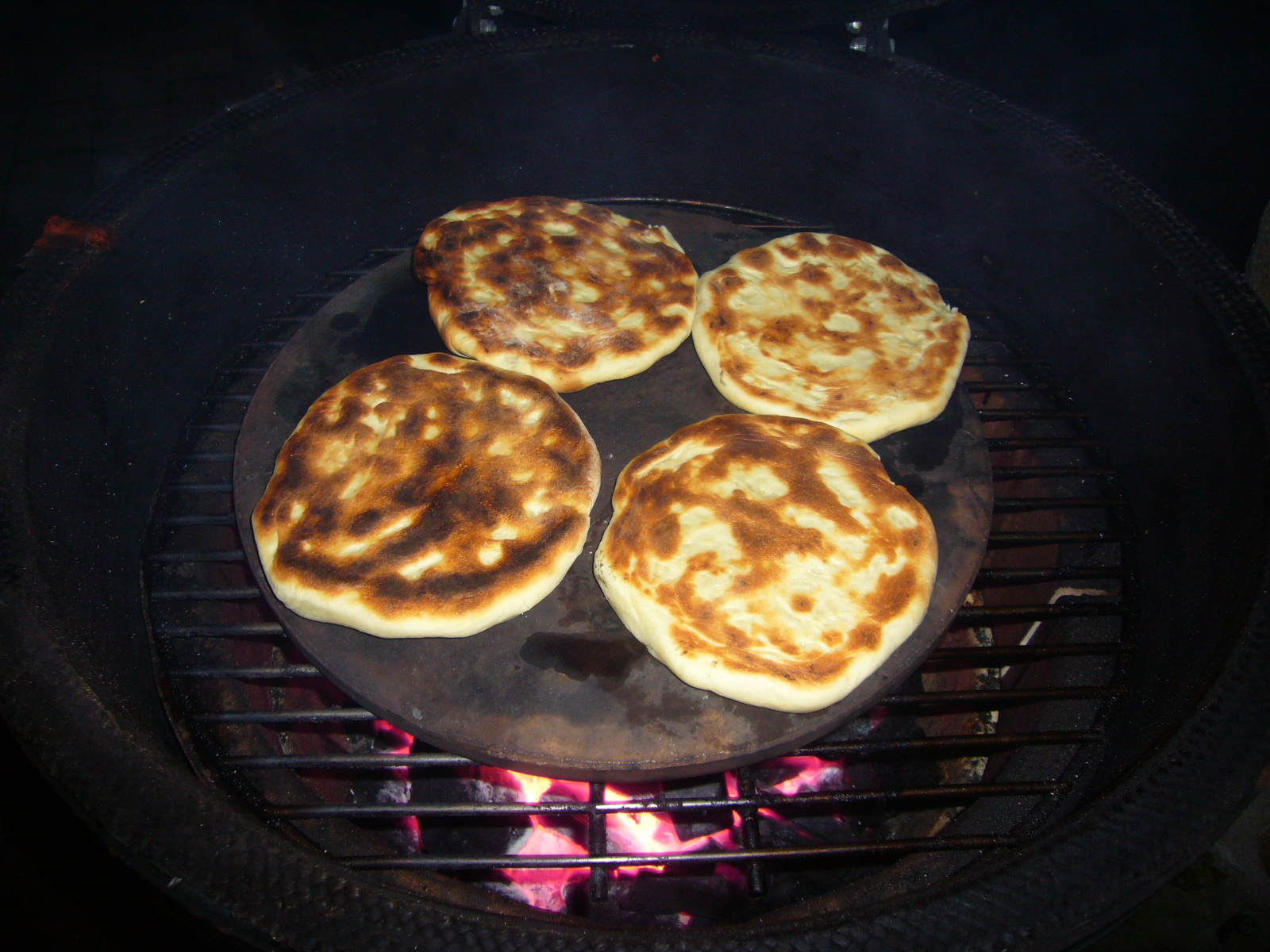 Flatten the dough balls into pancakes about a quarter inch thick, and brush tops with some more ghee. Bake on a pizza stone (4 should fit on at a time) preheated to 500, about 4 to 5 minutes per side, or until desired color is reached.