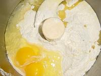 One extra large egg per 100 grams of flour works great. Set to closed lid position and process for 2 minutes on interval speed