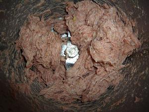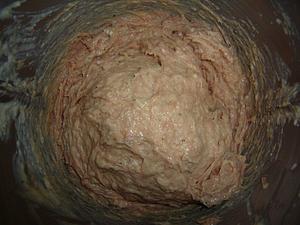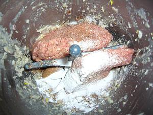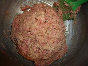 Turn veal mixture into a bowl and add beef. Mix with a spatula, by hand, until uniform. You do not want the beef integrated with the TM as that would affect the texture.