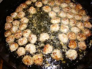 Heat oil in a large frying pan (I use a #12 cast iron pan). Adjust the amount of oil based on the width of the pan. Heat oil to 350F (175 C) and place balls in one at a time. Fry for about 7 minutes till brown all around, turning as needed.