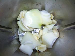 To peel garlic, process in TM, at speed 4, reverse, for 7 seconds to loosen the skin. Cut garlic in half, root to tip. Remove the center germ or sprout if green. Process the onion and garlic in the TM at speed 5 for 7 seconds.