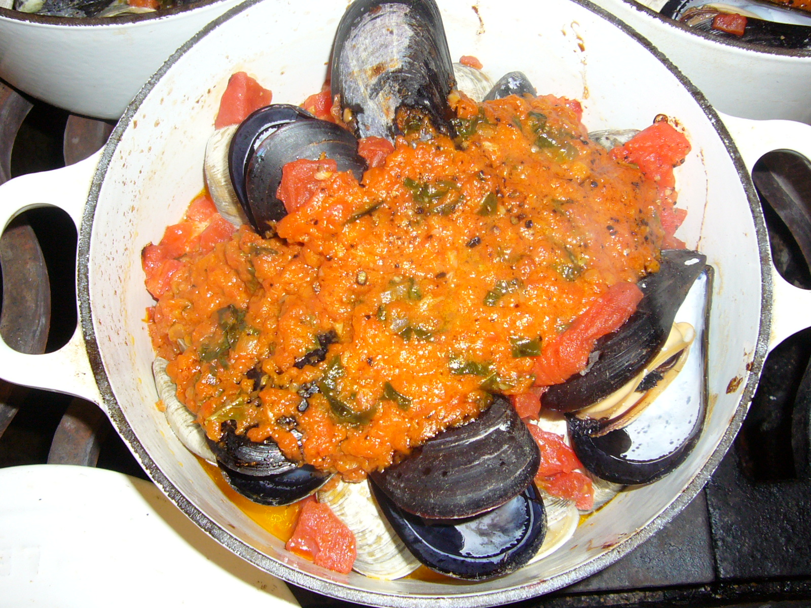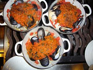 Cover and bake in a 500 degree preheated oven (as hot as it goes) for about 10 minutes, or till mussels and clams open. Don't overcook.