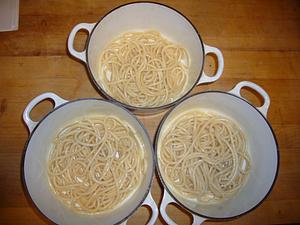 Divide the cooked pasta between the pots. Toss to coat with oil and to oil the sides of the pots.
