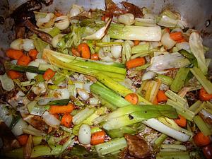 Add the veggies (mirpoix) to the roasting pan with the veal fat. Place back in the oven and roast till they too start to caramelize, stirring from time to time.