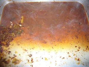 If the bones are still giving off scum and water temp is still raising, set veggies aside in a separate bowl. You should have a lot of brown fond in the bottom of the roasting pan.
