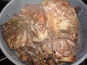 Add wine mixture to the veggies. When you're done skimming the stock, add the veggie mixture and the herbs. Allow to simmer for about 12 hours. Strain. I strain through a coarse colander to remove the bones and veggies, and then a very fine sieve (actually a fiber filter used for cleaning fryer oil) to remove the floating solids. Chill to harden fat which will collect on top of the stock. Remove and discard the congealed fat. Package the stock and freeze (I use my vacuum sealer to make 1 or 2 cup packages for adding to sauces.