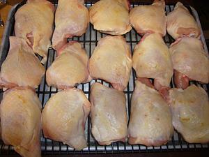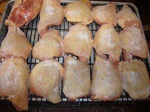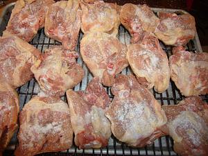 Chicken was put back in the fridge for about 1.5 hours. It came out pretty dry, but just a hint of damp on the bottom. This would be resolved by using a rack. Here you can see both sides as I add some DP.