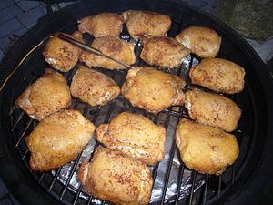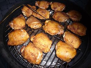 4. Gotta figure on 10 minutes (maybe 15) for chicken to finish. This means not opening the dome to reduce risk of fat igniting. Unfortunately, I don't have an insert probe that can take 500F, so we have to go by time.