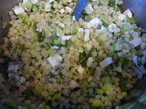 Saute the couscous in a pan till lightly browned. Cook off in boiling salted water. Rinse in cold water when done.