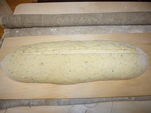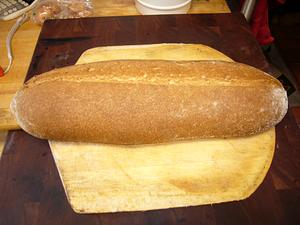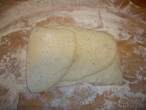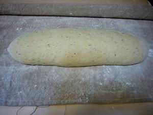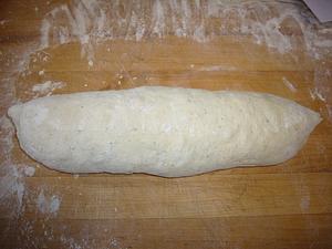 Allow the dough to rise for about an hour and a half. At this point, if you want to serve the bread later, you can put it in a plastic bag and refrigerate (that's what I did today. Dough was in the fridge for about 5 hours. The delay improves flavor, btw.) Shape the dough as you please. I got lazy and didn't take many pictures, and this one looks pretty sloppy, but it isn't an exact science. You could also make a boule or rolls.
