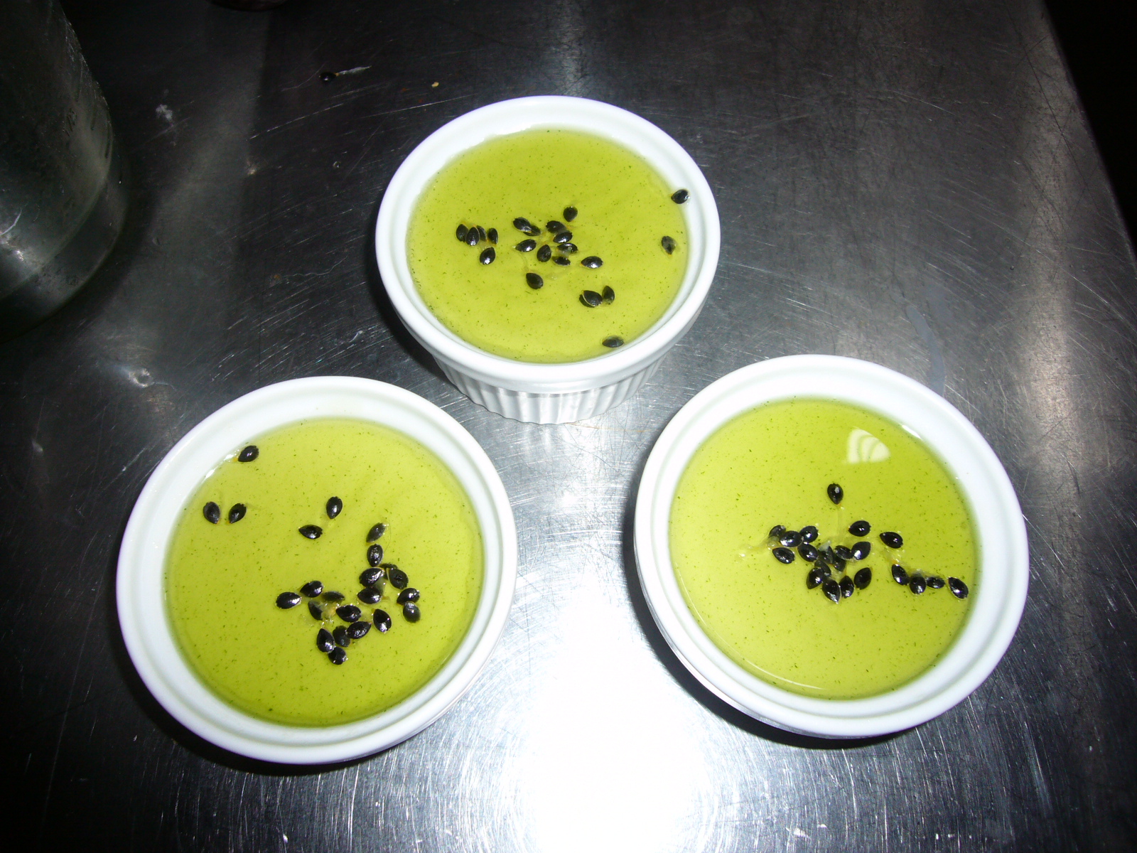 My favorite way to serve is to make a sugar syrup with a cup of sugar and a cup of water. Heat and reduce by about 1/3 or until a consistency you like. It can be rather thin. Place the syrup into a blender (or the ThermoMix) and add a handful of fresh basil leaves. Process on high for about a minute. Filter and reserve. Serve the pana cotta with a small ladle of the syrup. Sprinkle with cleaned passion fruit seeds (they are black to make a nice presentation, and crunchy to offset the creamy pana cotta.